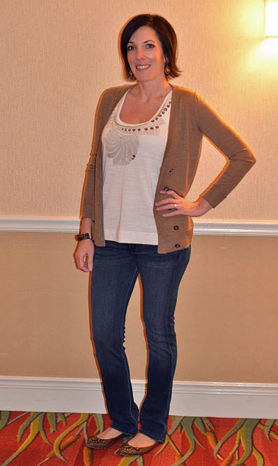 What Jo-Lynne wore: the sweater and embellished tank top are from Madewell last summer. These Citizens jeans are my current faves. These are so soft and stretchy, they feel like skin. Brown embellished flats are from Nine West.