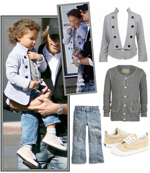 Nahla’s draling military jacket is a Little Paul and Joe gray military jacket ($72.15). Her cardigan is an All Saints children’s college cardigan in grey marl ($27.50). Also available in flint marl and black. Pair this with some light jeans like Levi’s toddler girls sweetie trouser flare jeans ($26). Nahla’s simple tan shoes are Keds Graham stone shoes ($26).