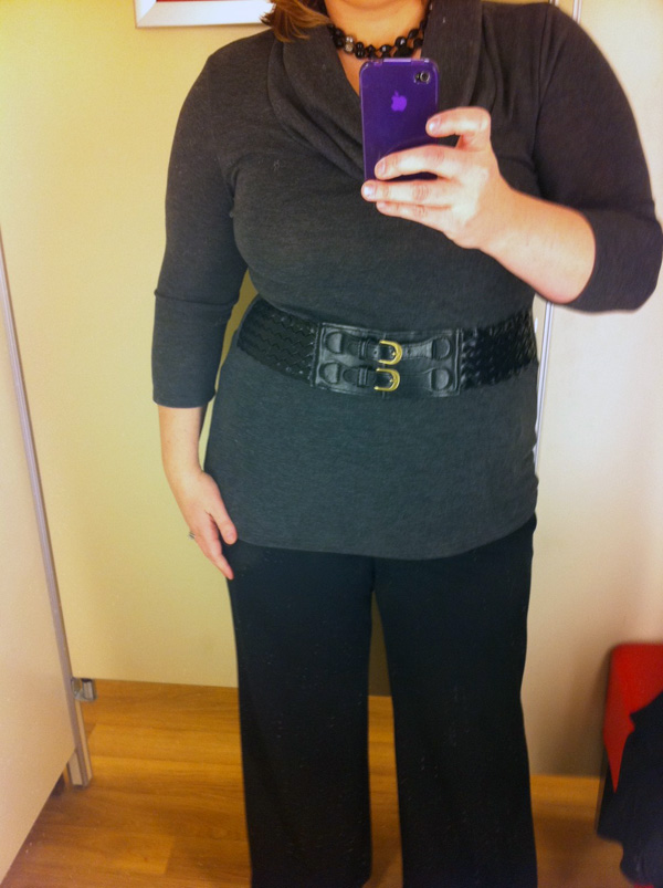 I ended up buying the poppy ruffled shirt, the belted gray sweater and the little black dress. I spent more than my gift card amount, but I’m pretty pleased with my purchases and feel happy that I walked out of there with pieces that I will be happy to add to my closet, not my consignment store pile.