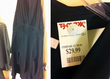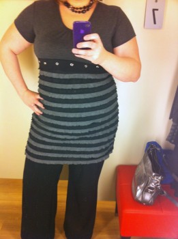 The first item up for consideration? This black and gray ruffled dress. I grabbed it off the clearance rack, where its $10 price tag was screaming at me. I thought it might look cute with leggings? Back in the day, I totally would have bought this. But my more mature self (HAHAHA) decided that it wasn’t flattering enough to spend my money on it. Next!