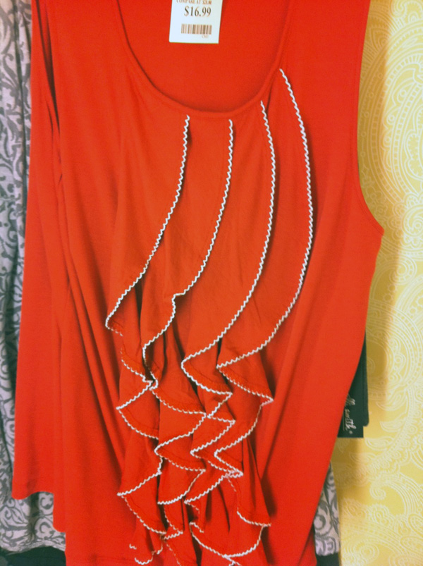I know it’s not news to anybody, but my STARS were there a lot of ruffles on the racks. This is a trend that can be difficult to pull off – too many ruffles and you’re walking out looking like Bozo the Clown, which is obviously not a great look for anyone (sorry, Bozo). But this shirt was very flattering, a good length and the ruffles were pretty subtle. Or, you know, as subtle as a ruffle can be. Let’s put this one in the maybe pile.