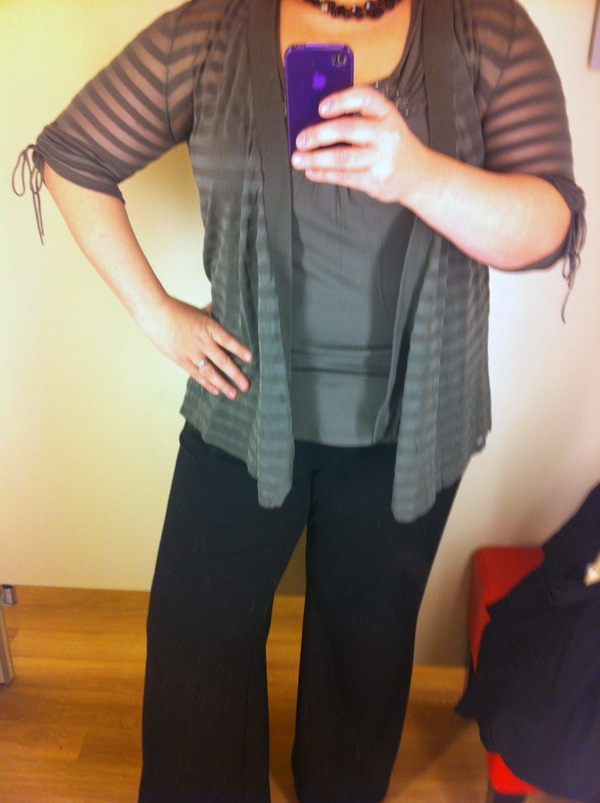 By now, it is well established that I am a cardigan junkie. It’s a little hard to tell in the picture, but it’s basically a sheer cardigan with solid stripes throughout. The color was great for my coloring – my eyes looked like they matched the green, and it was pretty flattering. I tried on the matching shell underneath, but decided that I could probably get away with one that I already have. I originally put the cardigan in the yes pile, but something was making me question that decision – so I ended up leaving it at the store that day.
