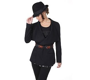 If you’re looking for something super versatile, try this drape open front ponte jacket from LOGO by Lori Goldstein. This would make a fabulous layering piece, you can wear it with a belt (like the picture) or loose, perfect for dressing up or down: