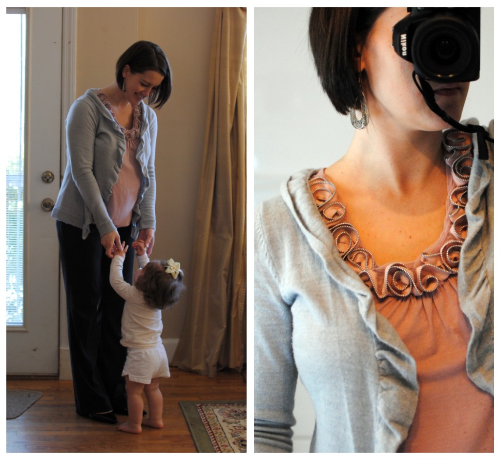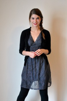 What Nicole Wore: black ruffle trim cardi from Old Navy, grey lace dress from target (two years ago, for only $5!), black tights from new york & company, black suede booties from charlotte russe (not pictured)