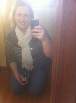 What Becky Wore: Cardigan: Gap, two years ago, Cami: Gap Maternity, three years ago! I can’t give it up, I love that they’re longer than “normal” camis and provide more chest coverage, jeans: GAP long and lean, scarf: Old Navy, two years ago, sunglasses: Nine West, last year, iPod: my beloved red nano, three years ago