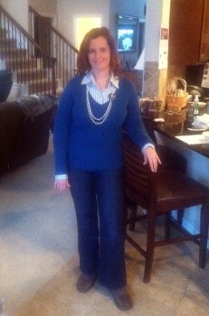 What Sarah Wore: Striped blouse is from Target. Blue sweater is Ann Taylor LOFT. Jeans are Lucky Brand. Shoes are chocolate brown Uggs in Classic Short style. Necklace is from Stella and Dot.