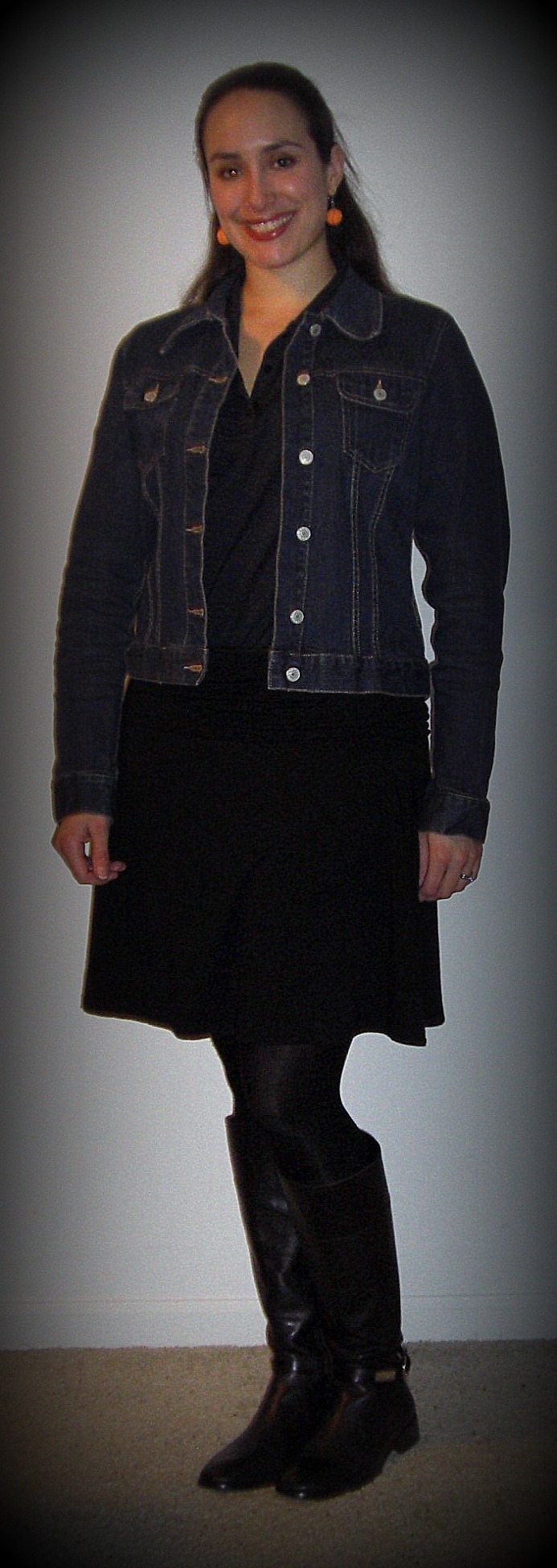 What Cita Wore: Old Navy / Thrift Store jean jacket like this one, my coach’s jersey, Old Navy Roll-Over Jersey Skirt, Express tights like these, Antonio Melani low-heeled boots like these, basketball earrings kind of like these