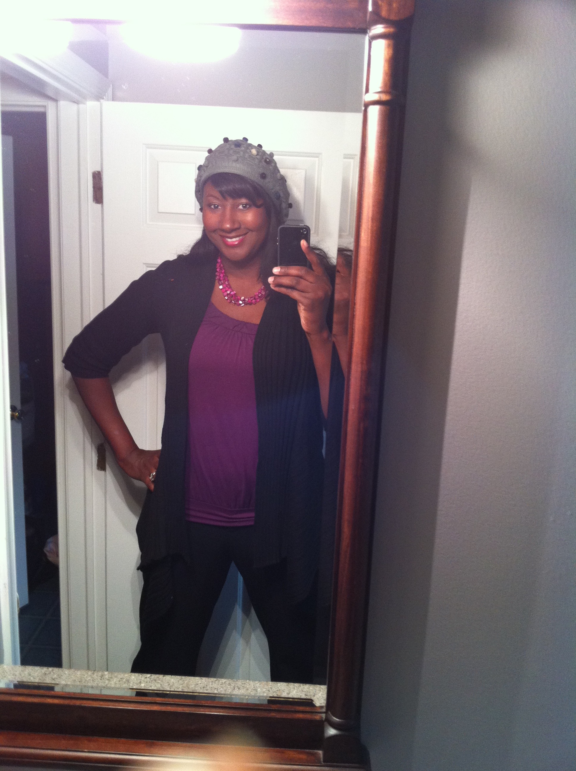 What Penny Wore: The hat from Nordstrom Accesories $13.90, sweater is the Ribbed Drapey Cardigan from White House Black Market $88. The purple shirt is no name from my closet, pants are Ann Taylor Tall Collection online (about $100, but paid about $50 with sales). Jewelry is from Debi Fashions