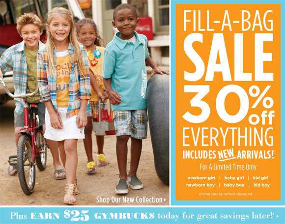 Gymboree has long been my favorite store for kids’ clothes. My children are now just starting to outgrow these adorable, well made clothes, and it is a sad, sad day. However, if YOU have younger kids, you might want to run out to Gymboree right now because EVERYTHING is 30% off. Plus you can earn Gymbucks.