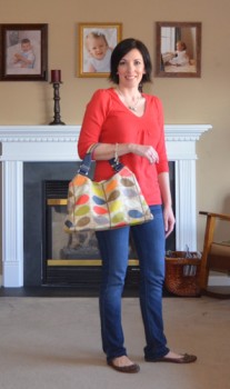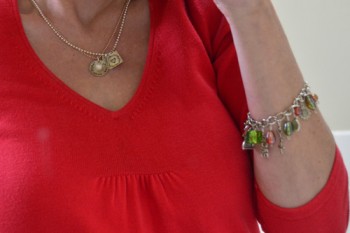 What Jo-Lynne wore: Orange 3/4-sleeved V-neck sweater from Banana Republic Outlet, Citizens straight-leg jeans, bag by Orla Kiely, embellished Flats from the Nine West store. Necklaces – Lisa Leonard and Vintage Pearl (they were in my Blissdom swag bag!) and charm bracelet by JanMary Designs.