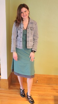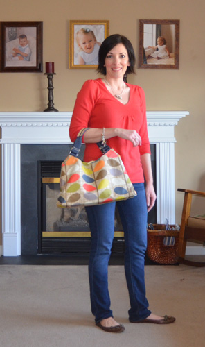 Where: Running around town, errands and such. I love the bright coral for spring, and the denim and brown shoes tone it down just enough. The bag is an old favorite that I always pull out to cheer me up this time of year, and each piece of jewelry has a special significance.