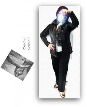 What Grace Wore: Gray ribbed knit cotton turtleneck from GAP, black/gray silk scarf, black lambskin jacket by Reed, black straight-leg jeans by Pierre Cardin and pewter flats by ME TOO. Silver oval link earrings from Nordstrom.