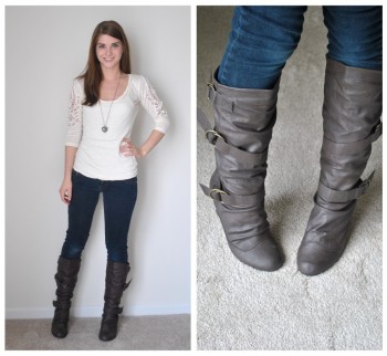 What Nicole Wore: burnout lace top from Urban Outfitters, dark rinse skinny jeans from Arden B, slouchy belted boots from Charlotte Russe, silver heart pendant from Target