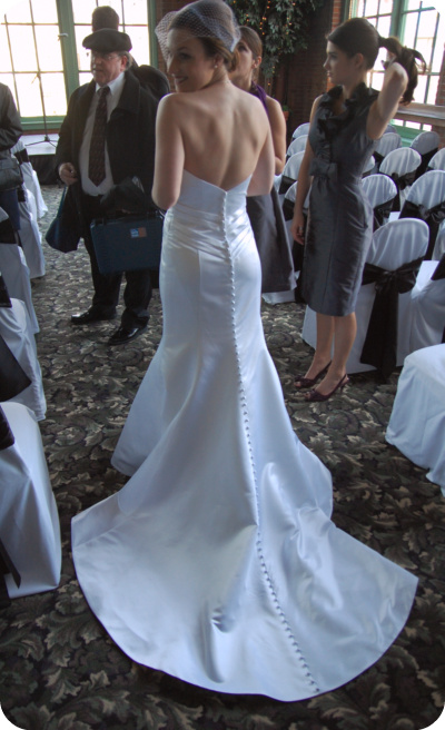 Then the bride and groom went outside to take some pictures on the city streets. They came back inside (a little chilly, since it was Cleveland in March!) and my sister and I almost died. Her dress was SO dirty. The train had dirt all over it!