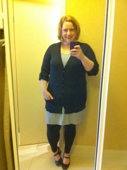 What Becky Wore: Dress from TJ Maxx, boyfriend cardigan from Old Navy , leggings from Style & Co at Macy’s (we discussed my sadness over their departure last week), shoes from Kenneth Cole Reaction.