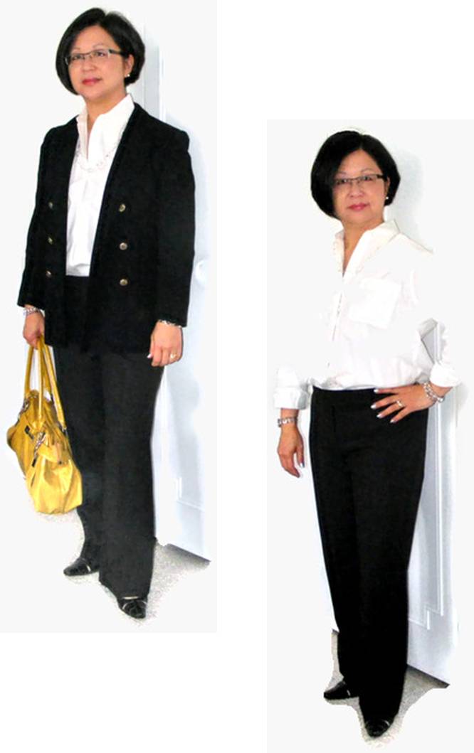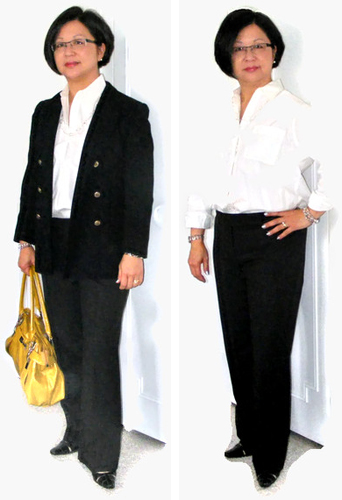 What Grace Wore: Black double-breasted jacket by Jones New York, charcoal gray wool slacks by Ann Taylor, white cotton man-tailored shirt, black pumps with white stitching by Etienne Aigner. These are all classic pieces I’ve had forever. Mustard patent-leather purse is the Korean brand Elegance. Large stud earrings and watch from Target, rope design hinge bracelet from NY&Co.