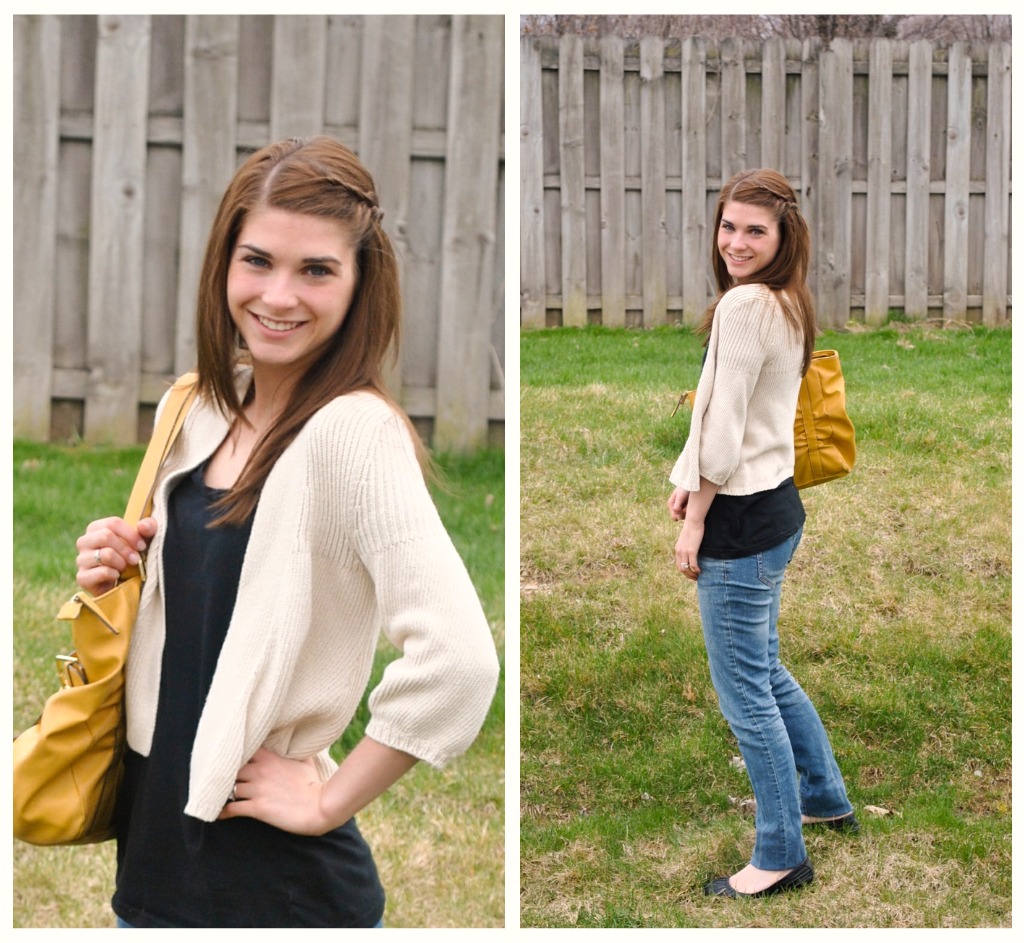 What Nicole Wore: black slouchy tee from Gap, creamy cardigan from urban outfitters, skinny jeans from Target, black flats from bakers and mustard purse from Target
