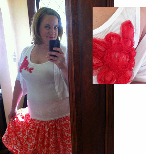 Gap skirt, from about two years ago when skirts were longer than 6″; Old Navy tank from last year; Old Navy cropped cardigan to throw on top. I wore this out to lunch with my husband to celebrate our sixth anniversary. This is my absolute favorite skirt, and it was my first time pairing it with this tank. They’re not an exact match, but I definitely liked it together. I love when a simple tank has such a fun embellishment!