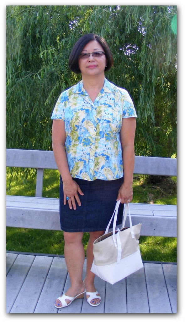 What Grace Wore: Denim skirt by Ann Taylor, vintage inspired cotton blouse by Karen Scott Sport, both from thrift stores. The blouse has a boxy silhouette but is balanced by the narrow skirt. White and cork wedges by Bass. “Free with Gift” white and tan tote from Lancome, modified with interior pockets by me. Large silver stud earrings and my mom’s vintage Vietnamese glass cocktail ring. I wore this to a Memorial Day barbeque, of course!