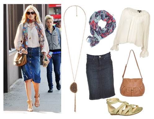 Forever 21 Necklace $7.80, DELiA*s Scarf $19.50, Topshop Blouse $36.00, Levi’s 512 Denim Skirt $44, Urban Outfitters Satchel $29.99, and Max Studio Shoes $99.00.