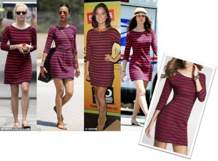 Kate Middleton’s taste in bargain clothing has spread to Hollywood. Celebrity fashionistas have been spotting stepping out in clothing from TopShop, H&M and Express lately, most notably, this three-quarter sleeve striped cotton dress seen on Amanda Seyfried, Zoe Saldana, Olivia Munn and Emmy Rossum over the past month.