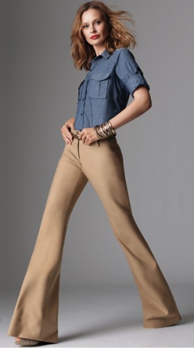 This trouser is designed to elongate the leg. It sits high on the waist and gets fuller at the bottom so you can wear them over heels. Ideally this pant should come to about 1/2-inch from the floor, no matter what shoe you are wearing. If it is too short, it will make you look frumpy; and if it’s too long, it will just look sloppy. So be sure to choose a heel height that works with the pant and your body, or be prepared to have them hemmed.