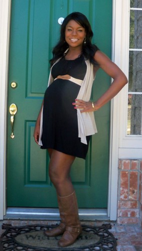 What Valerie Wore: I’m 38 weeks pregnant, and the weather in Texas has finally cooled down enough to dress for Fall. I’m extending my summer maternity wardrobe by wearing a halter sundress (consignment) with a maternity belt (from a different consignment-found dress) and Diba ‘Never Enough’ flat boots. I cannot remember exactly where I found the earrings (probably Forever 21) and the bracelet is Kate Spade.