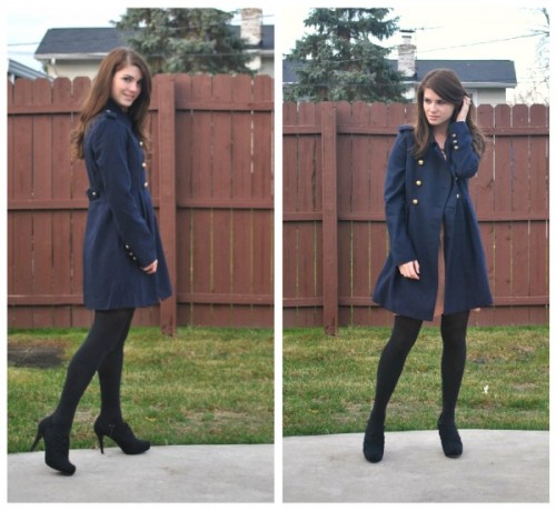 What Nicole Wore: admiral military coat c/o shopkempt, ruffle dress from h&m, black tights from h&m, black booties from target (similar style). This coat from ShopKempt is one of my new favorites. The flirty pleats with brass buttons are the perfect combination. And I love pairing navy with black.