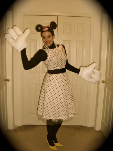 What Cita Wore: I found yellow Charlotte Russe pumps at Salvation Army, along with the red polka dot tress and Mouseketeer hat. I added cartoon gloves from eBay, ribbon and tulle from Joanne Fabrics, and my Cache turtleneck, Ann Taylor tights, and Kohl’s belt. Of course I added pearls and a little black tip nose to complete the Minnie Mouse costume!