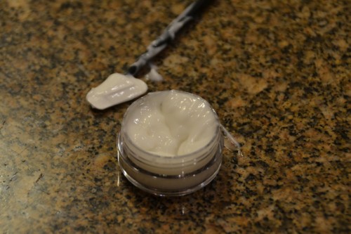 You just take the top off and use the spatula to scrape out any remaining bits of product, then you place it in the cosmetic jar provided.