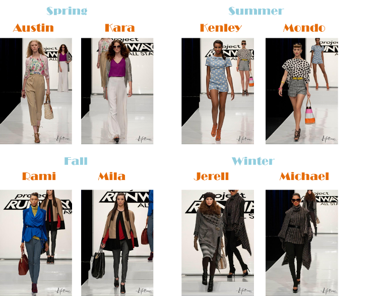 [Fall]: Mila took home the high score as her cape added a new silhouette to the runway. Overall her construction was poor and the rest of her outfit a bit lackluster, but the judges couldn’t see past Rami’s lime green drapped tee long enough to award him the high score. Or to even keep him one more week – as Rami was sent packaging. His jacket was impeccable though and the cobalt color was stunning, I would’ve sent Austin before him this week.
