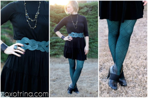 What Trina Wore: Black tiered dress from F21 {4 years old, couldn’t find anything similar}, teal braided belt from F21 {similar}, Vera Wang diamond patterned fishnets {similar} layered over teal tights by Nine West {similar}, black Seychelles booties {similar} worn with DIY shoe cuffs. Necklace is from Premier Designs and the ring is from Target {similar}. Customized peacock black leather cuff is from this Etsy shop. Nail polish is Ingrid by China Glaze and Moxie by Zoya.