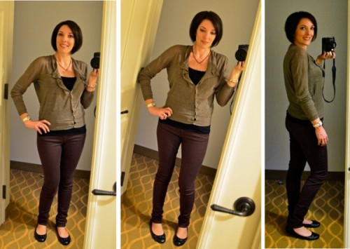 What Jo-Lynne Wore: Thursday was the first day of the Blissdom Conference, and I broke out my Joe’s Jeans – Visionaire Skinny Jeans in Raisin Deep Purple. I wore them with my asymmetrical sweater by Theme with a black tank and black ballet flats from Nine West.
