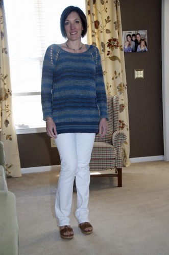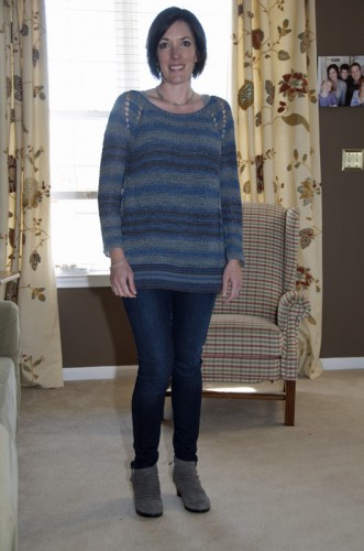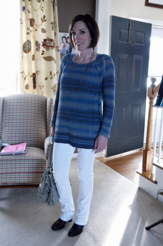 Before you give up on the sweater, may I suggest that you try it with a wide tan belt and pumps with the dark skinny jeans, also a much chunkier necklace. Instead of the pumps you could also do a cute pair of ballet flats. Also, how about an orange tank underneath instead of that grey to give it a bit of zing? Personally I don’t care for it with the white jeans, the blue/gray seems too wintery in contrast.