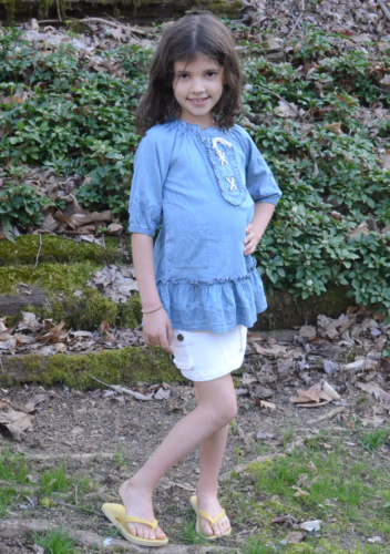 THese bright shorts are a must for spring (for Mama too, actually!). The soft, broken down in fabric is a sure hit with even the most picky kids – and the rolled style is perfect for those unexpected summer growth spurts 😉 My oldest, Ellie, is a huge fan of this look. She is not super girly, hating dresses, so colored shorts with an embellished top is a great way for her to be feminine but still comfortable.