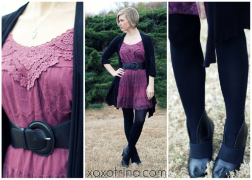 What Trina Wore: Lace dress scored on clearance from Target {similar in peach}, black open front cardigan picked up at Marshall’s {similar}, basic black belt, basic black tights, Seychelles booties {similar} with DIY shoe cuffs, I Love You 120 Languages necklace from NanoStyle.