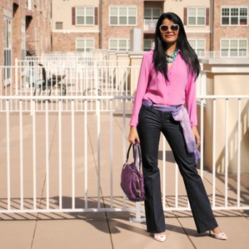 What Jyoti Wore: I am welcoming Spring in the Ann Taylor boot cut denim (giving my skinny jeans a break!), a hot pink silk shirt (JC Penney circa 2003), using scarf as belt (gifted) and Ann Taylor handbag (2009).