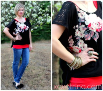 What Trina Wore: Floral top with lace shoulder insets found on clearance at Kohl’s {similar}, coral tank from Target, Taylor skinnies from Delia’s, black slingback pumps from Nine West with DIY pompom clips {similar look}. The necklace is the I Love You 120 Languages from NanoStyle worn with assorted bangles and a two tone ring. Polish is a leftover St. Paddy’s Day mani. Lips are Revlon Colorstay lipgloss in Papaya.