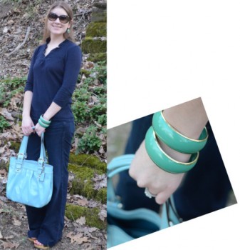 What Melissa Wore: I had a date night with the husband, so I threw on some jewelry to dress up the ruffled navy sweater and jeans I was wearing! The top is from Loft (two years ago) and the jeans are from 7 for All Mankind. Shoes are open-top clogs from Target and the purse is Coach. All the jewelry is from the Banana Republic Outlet – it was all on the clearance rack and was an additional 40% off, so I think the bracelets and earrings added up to about $10!