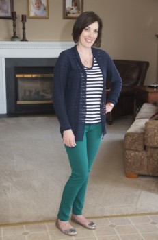 What Jo-Lynne Wore: I wore this next outfit shopping with a friend. It was drizzly and damp that day, but not too cold. I wore a navy and white striped V-neck tee from Gap with a thin navy cardi from Banana Republic (a few years ago). The jeans are DL1961 Emma Leggings in Mermaid, and I absolutely love them. I wear them every chance I get. I accessorized with Studio Jewel encircled earrings and necklace and a Lagos bracelet. Silver ballet flats are from Aldo.