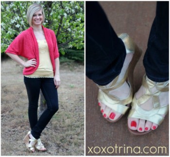 What Trina Wore: Worn to a Southern Living focus group video shoot, where the dress requirements were “Spring colors”. AB Studio cocoon cardigan from Kohl’s {similar}, yellow tank with lace hem {similar}, Marc Alan dark wash skinnies {similar}, and Dolce Vita for Target wedges in gold {similar}. Gold and clear beaded Premier Designs necklace {similar} worn doubled. Polish is Sooki by Zoya.