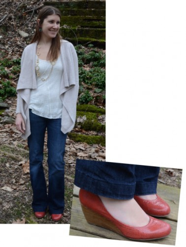 What Melissa Wore: Old Navy wrap, scored on clearance for $3 {similar here} with a tank from free people {similar here} and jeans by 7 for All Mankind {buy here}. She LOVES these new shoes by BCBG {similar here} just scored at TJ Maxx for a steal. Necklace is old, by Lia Sophia. Wore this to church and out running errands.