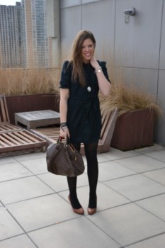 What Jenny Wore: Out to lunch and shopping with her mom. Alice Temperley for Target black belted mini dress (now available on eBay), HUE control top black opaque tights (bloomingdales.com), Tiffany & Co. sterling silver charm bracelet, $575 for bracelet, charms vary $175-300 apiece and sterling silver chain link bracelet (discontinued similar styles starting at $150, tiffany.com), Humanity for All leather strap bracelet, Vuitton Speedy 35 in damier canvas, Marc Jacobs Lola perfume solid ring, Cole Haan Air Talia pumps in Woodbury, Dior Swarovski crystal pendant necklace with lipgloss inside.