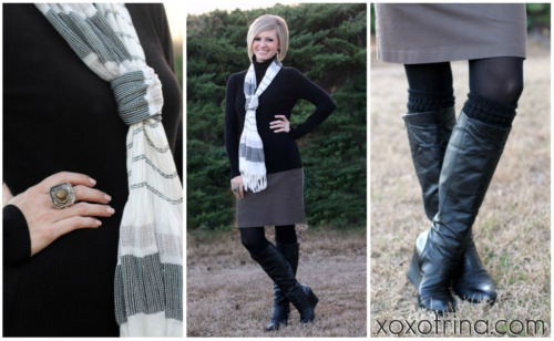 What Trina Wore: Basic black turtleneck from CAbi {similar}, striped scarf picked up at a booth sale, NY&Co skirt thrifted for $1.00, black tights, black OTK socks from Sock Dreams and black wedge boots by Steve Madden. Ring is a treasure picked up at a local salon and nail polish is Kelly by Julep.