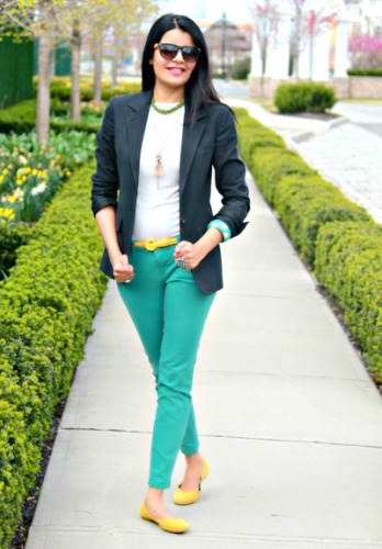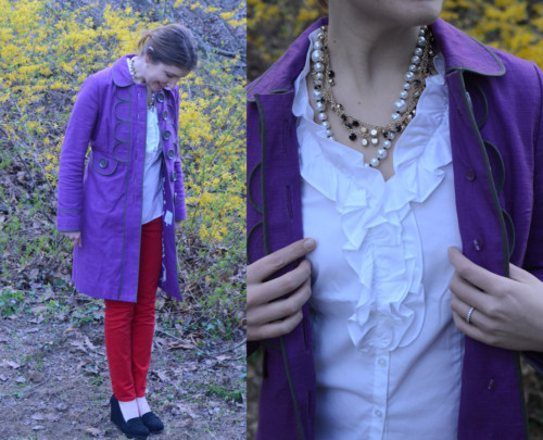What Melissa Wore: I’m going bright this week! I paired my fav spring coat (picked up at the Boden Warehouse Sale last year) with my red jeans and this fab necklace I just bought on clearance for only $3! SCORE!