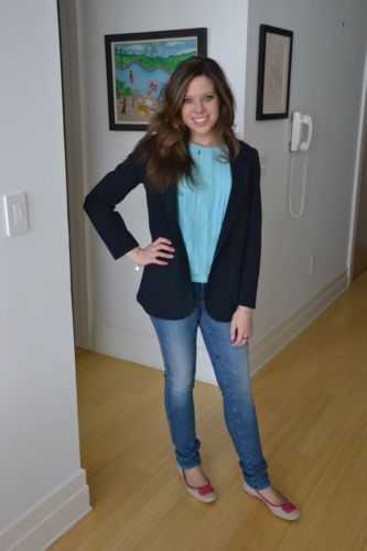 What Jenny Wore: around Brooklyn for errands and then to a casual celebratory dinner for my boyfriend’s new job! Navy oversized “Girlfriend” blazer by Aqua for Bloomingdale’s {similar}, Jason Wu for Target silk blouse {buy here}, J Brand skinny jeans {similar}, Ferragamo “My Charm” shoes in Fuscia {buy here}, Elsa Peretti for Tiffany & Co. sterling silver charm bracelet {similar}