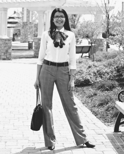 What Jyoti Wore: My inner geek came out to play this week! Shirt by Brooks Brothers, pants by New York and Co., scarf from a weavers co-operative society in India and bag by Ann Taylor