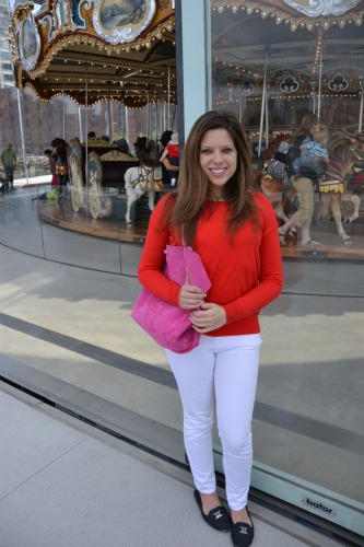 What Jenny Wore: She wore this to Jane’s Carousel in DUMBO, Brooklyn. Madewell “sweatshirt” sweater (Buy here on sale for $49), GAP ribbed tank top (Buy here on sale for $12), Levi’s 524 Skinny jeans in white (Buy here on sale for $40), Tory Burch Kendrick driver shoes, and Tiffany & Co. reversible tote.