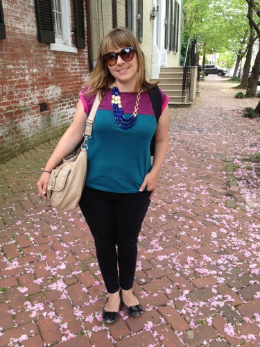 What Maria Wore: We were out in Old Town, Alexandria this weekend in Virginia and I wore a color block shirt from Primark, my go to skinny jeans, my Clarks flats, tortoise sunnies from Target and my new Bahari necklace given to me by Stella & Dot Stylist Kristin Biggs. I also ended up carrying my son’s backpack on top of my own bag!