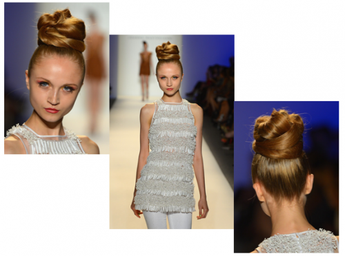 [Expert Tip: Don’t have the length to create this style? Fake it! Models with shorter hair or less thickness wore hair pieces to add fullness.]